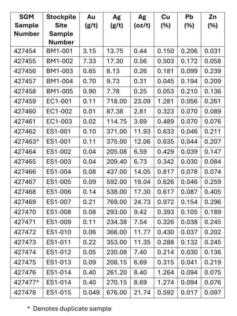 A total of 23 trench samples were collected and submitted for analysis, from the Company’s three separate stockpile properties: the ES1, EC1 and BM1 respectively. All samples were delivered to the Servicio Geologico Mexicano (SGM) lab in Oaxaca, Mexico for multi-element and fire assays. The assay results are listed below:
